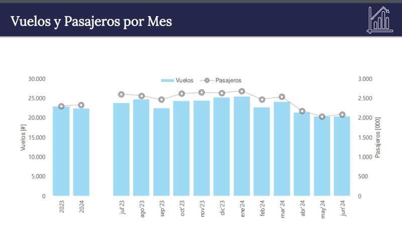 En cuanto al tráfico internacional, si bien se registra una desaceleración en los últimos meses, se mantuvo en números negros con un + 13.9% en junio versus igual mes de 2023 y un acumulado del +15%. En total entraron o salieron del país vía aérea unos 974.000 pasajeros en el sexto mes del año.