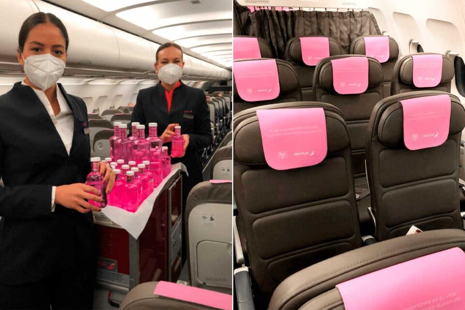 Esta acción no solo se desarrolla a bordo de los aviones de Iberia, también en tierra, concretamente en sus dos Premium Lounge de la T4 del aeropuerto de Madrid, Dalí y Velázquez. También aquí las botellas de cortesía disponibles para los clientes de Iberia serán de color rosa.